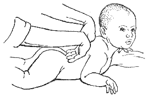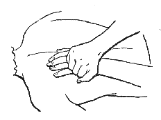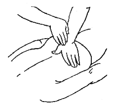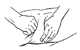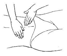 При выполнении сотрясения живота обе руки нужно расположить так, чтобы большие пальцы находились на воображаемой линии, пересекающей пупок, а остальные пальцы обхватывали бока. Затем следует производить колебательные движения горизонтально и вертикально (рис. 104).