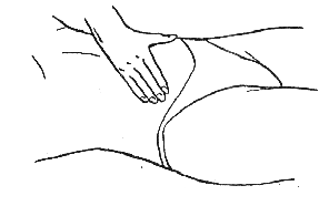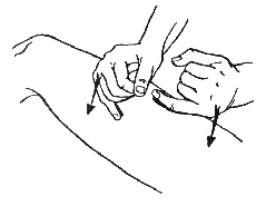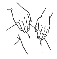 При выполнении прямолинейного поглаживания движения производятся ладонью, кисть должна быть расслабленной, а пальцы прижаты друг к другу, кроме большого, который следует отвести немного в сторону. Кисть руки должна плотно прилегать к массируемой поверхности тела, движения следует производить большим и указательным пальцами. Они должны быть легкими и скользящими.