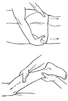 Для выполнения продольного поглаживания большой палец нужно отвести как можно дальше, затем кисть следует наложить вдоль массируемой поверхности. Движения следует производить кончиками пальцев вперед. Если продольное поглаживание выполняется двумя руками, движения нужно производить попеременно.