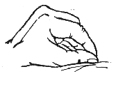 Обхватывающее поглаживание используют для массажа верхних и нижних конечностей, области ягодиц, шеи, а также боковых поверхностей туловища. Производят обхватывающие поглаживания расслабленной кистью руки, при этом большой палец должен быть отведен в сторону, а остальные пальцы должны быть сомкнуты. Кисть должна плотно обхватывать массируемую поверхность (рис. 66). Движения могут быть непрерывными, а могут быть и прерывистыми (в зависимости от поставленных целей).