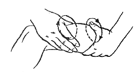 При массировании мелких суставов можно выполнять кругообразное поглаживание. Делать движения следует основанием ладони, делая круговые движения в сторону мизинца. При этом движения правой кистью будут направлены по часовой стрелке, а движения левой кистью — против часовой стрелки.