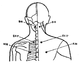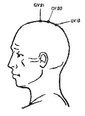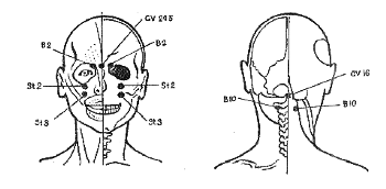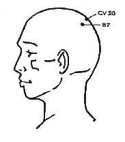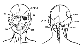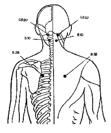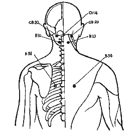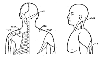 Поставить большие пальцы обеих рук на точки GB 20 у основания черепа. Выполнять