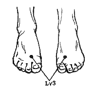Указательный и средний пальцы руки поставить на точку Lv 3 в верхней части стопы