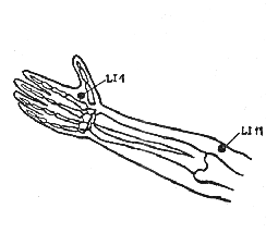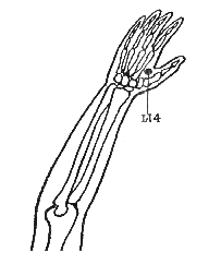 Точка LI 14 (“кость внешней части руки”). Симметричная, находится на внешней