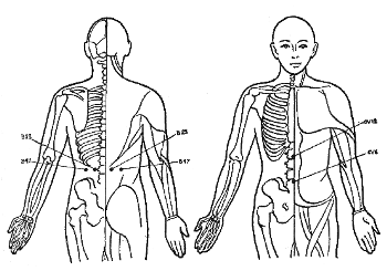 см от позвоночного столба влево и вправо (рис. 204). Снимает боли в плечах и