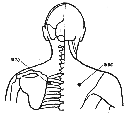 на 1 палец вниз от верхнего края плеч, в центре линии, идущей от бокового края