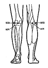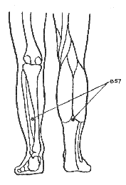 Обеими руками обхватить голень так, чтобы большие пальцы легли на точку В 57