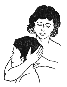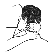 Необходимо встать вплотную к больному и положить локти на его плечи, а ладони расположить чуть ниже ушных раковин (если нужно воздействовать на верхние сегменты шейного отдела позвоночника) (рис. 223).Для воздействия на средние и нижние сегменты шейного отдела ладони нужно опустить чуть ниже, приложив основания ладоней на поперечные отростки второго шейного позвонка.