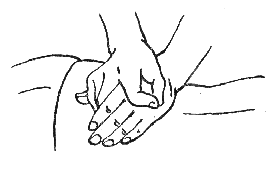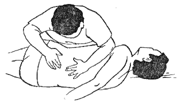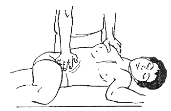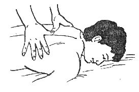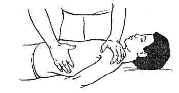 1, И. п. — лежа на животе. Ассистент ладонями оказывает умеренное воздействие на ребра пациента по обеим сторонам позвоночного столба в направлении снизу вверх и в сторону от позвоночника к плечам. Продолжительность каждого воздействия 2-4 секунды.