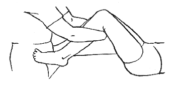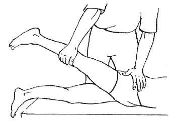 3. Следующий прием выполняется в положении пациента лежа на спине. Если прием выполняется с помощью ассистента, он должен зафиксировать ноги больного в лодыжках. Если ассистента нет, пациент должен лечь таким образом, чтобы его ноги были согнуты в коленных суставах, а голени свисали с кушетки.