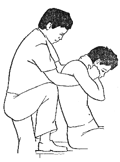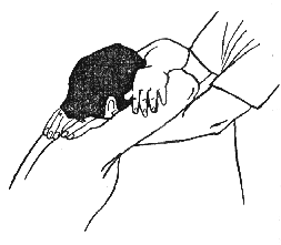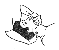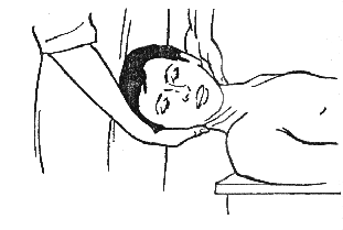 Необходимо встать у изголовья пациента и одной рукой взять его за подбородок, а другой обхватить затылок (рис. 225). Колени выполняющего прием должны быть слегка согнуты, а стопы параллельны.