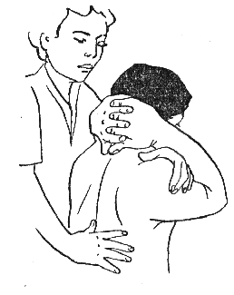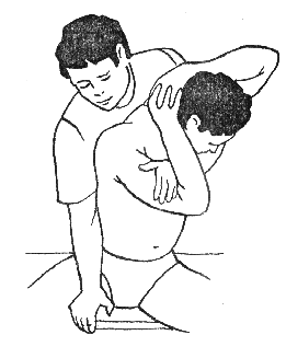 Пациент садится на кушетку, скрестив руки на груди и обхватив кистью левой руки правый плечевой сустав, а кистью правой руки — левый плечевой сустав. Врач должен встать за спиной пациента и захватить его локтевые суставы (рис. 228).