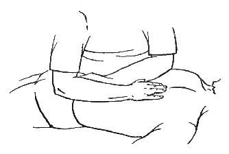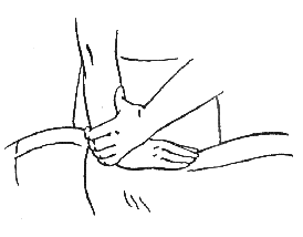 4. И. п. — лежа на животе на матрасе или любом другом мягком основании. Ассистент располагает руки на спине пациента в области остистых отростков и большими пальцами, перемещая их от позвоночного столба, начиная у основания шеи и заканчивая у крестца, выполняет мягкое, но достаточно энергичное надавливание на мышцы спины. Пациент во время проведения приема не должен испытывать болезненных ощущений.